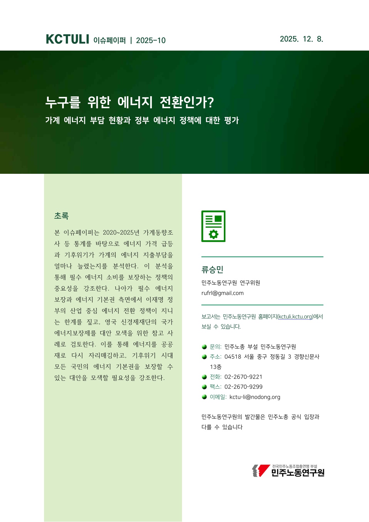 [2025-10]누구를 위한 에너지 전환인가? - 가계 에너지 부담 현황과 정부 에너지 정책에 대한 평가