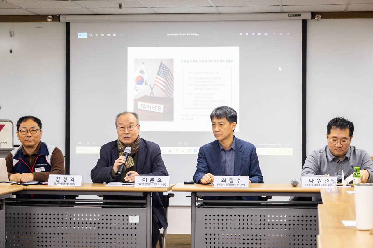 12.19 토론회가 개최되어 나원준·최필수 교수가 발제하였고, 김상민(금속노조), 김성혁 원장, 주제준(트럼트공동행동), 정성희 정책자문위원이 토론하였다. 과도한 대미 투자로 인한 국내 투자 부족, 수출감소, 고용감소 등 산업공동화 우려가 제기되었다.