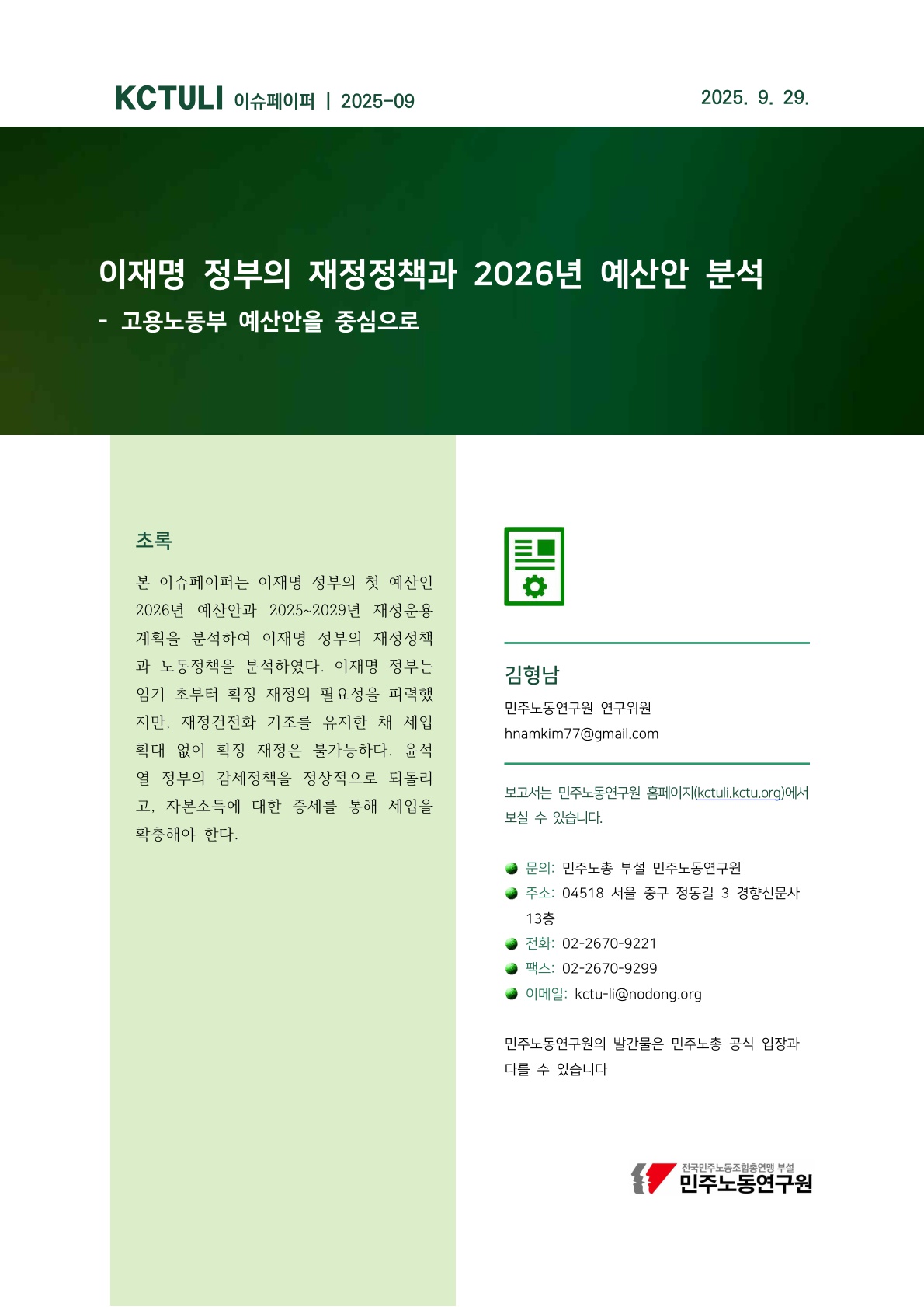 [2025-09]이재명 정부의 재정정책과 2026년 예산안 분석-고용노동부 예산안을 중심으로