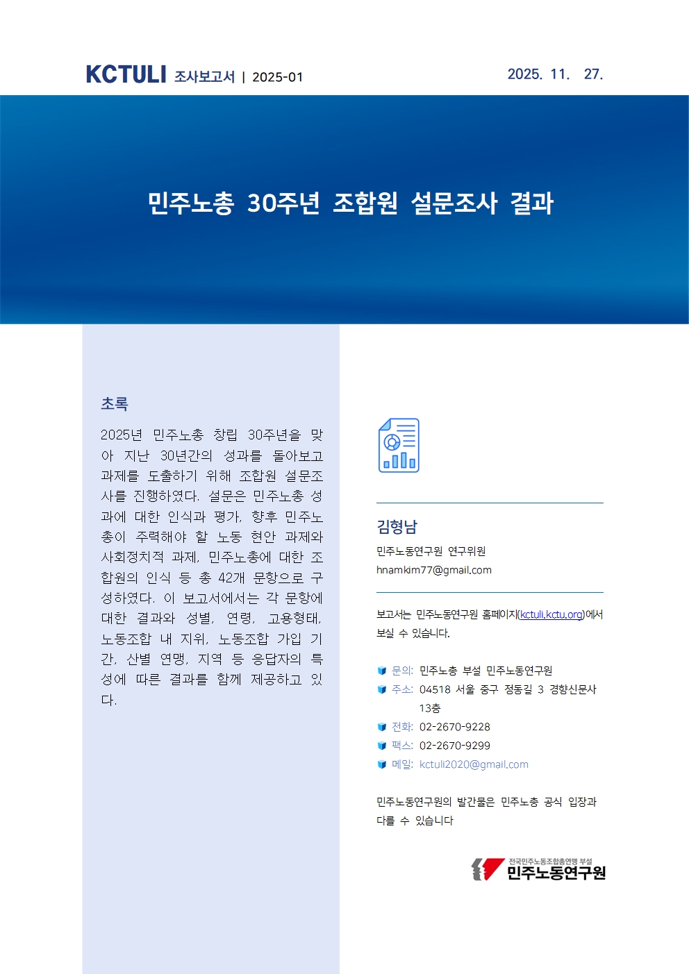 2025년 민주노총 창립 30주년을 맞아 지난 30년간의 성과를 돌아보고 과제를 도출하기 위해 조합원 설문조사를 진행하였다. 설문은 민주노총 성과에 대한 인식과 평가, 향후 민주노총이 주력해야 할 노동 현안 과제와 사회정치적 과제, 민주노총에 대한 조합원의 인식 등 총 42개 문항으로 구성하였다. 이 보고서에서는 각 문항에 대한 결과와 성별, 연령, 고용형태, 노동조합 내 지위, 노동조합 가입 기간, 산별 연맹, 지역 등 응답자의 특성에 따른 결과를 함께 제공하고 있다.